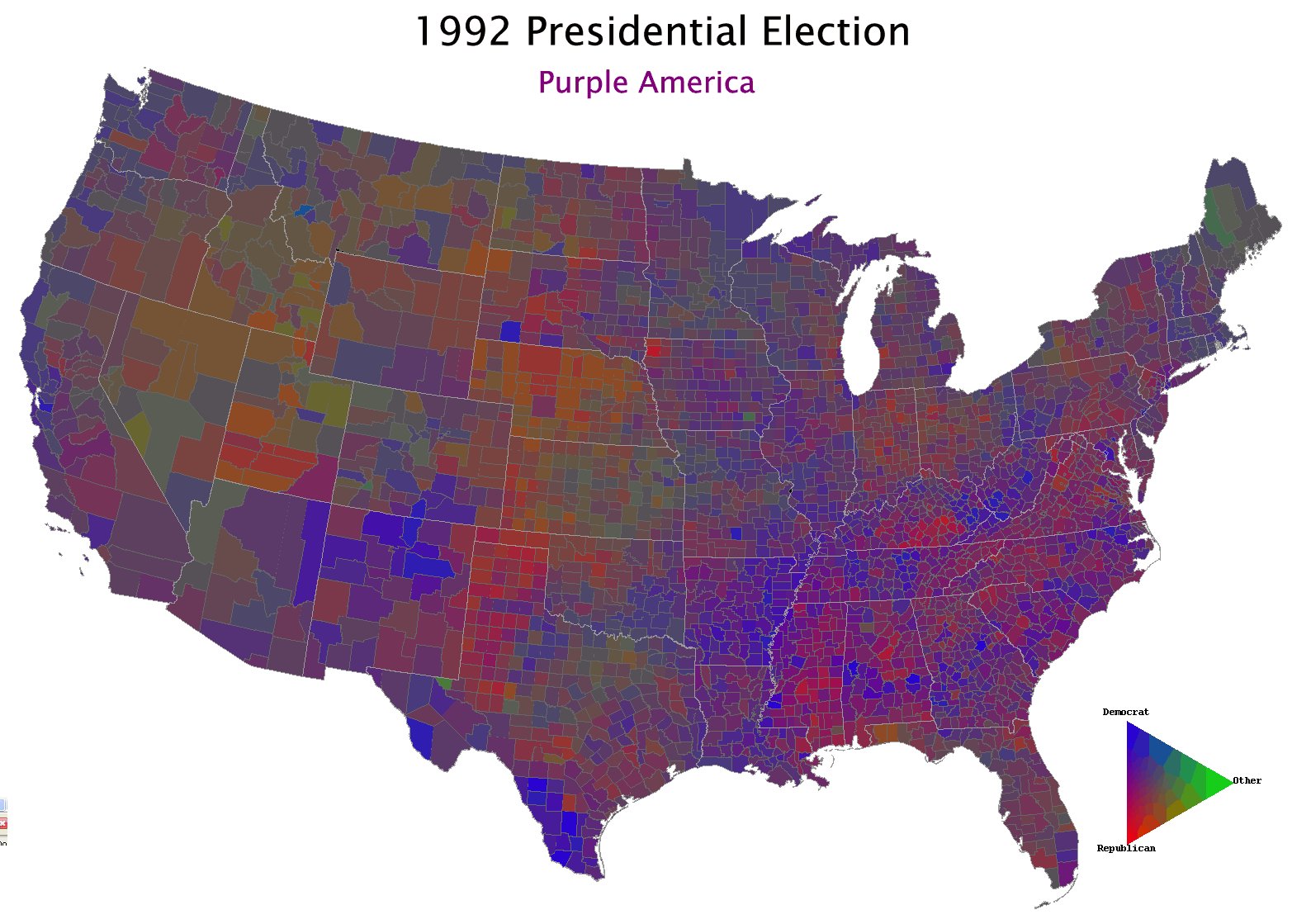map–areas of Perot (independent–shaded in green) strength, 1992 election: