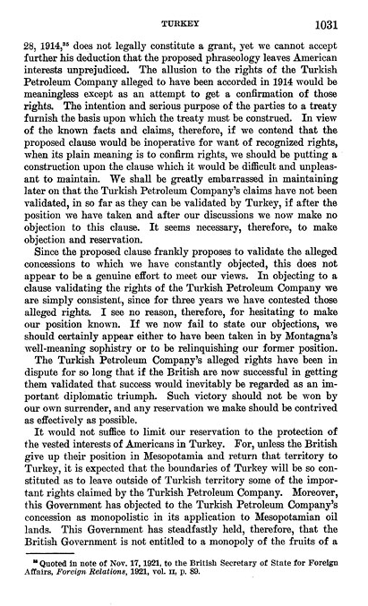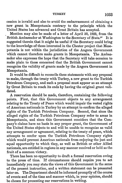 Documents: Foreign Relations of the United States, 1923 missive from State Department objecting to British attempts to consolidate control over Middle Eastern oil, especially in Iraq.