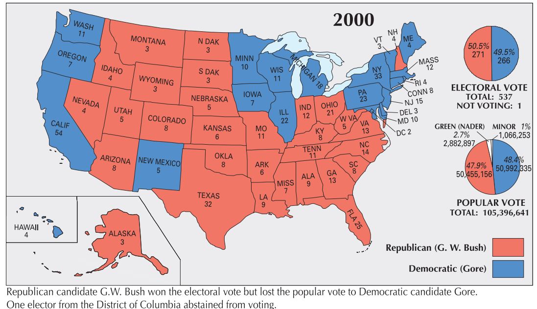 2000 presidential election map. Note that if Al Gore had carried his home state (TN) or Dem-leaning NH, the results in FL would have been irrelevant: