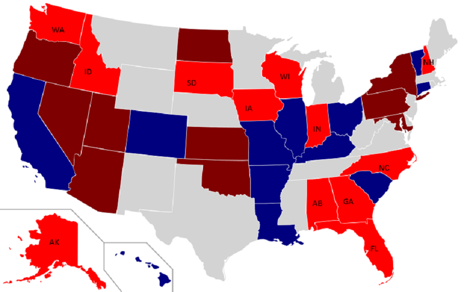 1980 Senate campaign map: bright-red states represented Republican pick-ups (12-seat gain, take control of Senate for first time since 1955):